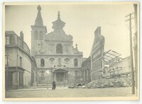 La façade de l' Abbatiale vue de la rue avec une personne devant la grille et sur la droite une entreprise complètement détruite lors de la libération 1918.Créateur : Photographies Touly,4, Cité Magenta, Paris XeDate : 1918/1919Type : Image, Image fixe, PhotographieMots‑clés : Destructions, Première Guerre mondiale, Vie religieuse, Dommages de guerre : 1918, photographies Touly, Carte postale allemande -