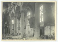 Les colonnades de l' Abbatiale Saint-Martin endommagées lors de la libération 1918.Créateur : Photographies Touly,4, Cité Magenta, Paris XeDate : 1918/1919Type : Image, Image fixe, PhotographieMots‑clés : Destructions, Première Guerre mondiale, Vie religieuse, Dommages de guerre : 1918, photographies Touly, Carte postale allemande -