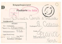 Mentions manuscrites au verso de la carte postale tamponnées par le Stalag.Date : 1942-08-30Type : Image, Image fixe, Photographie, Carte postaleMots‑clés : Seconde Guerre mondiale, Carte postale allemande -