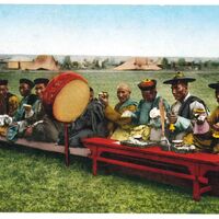 Lamas en office traditionnel religieux mongole au début du XXème