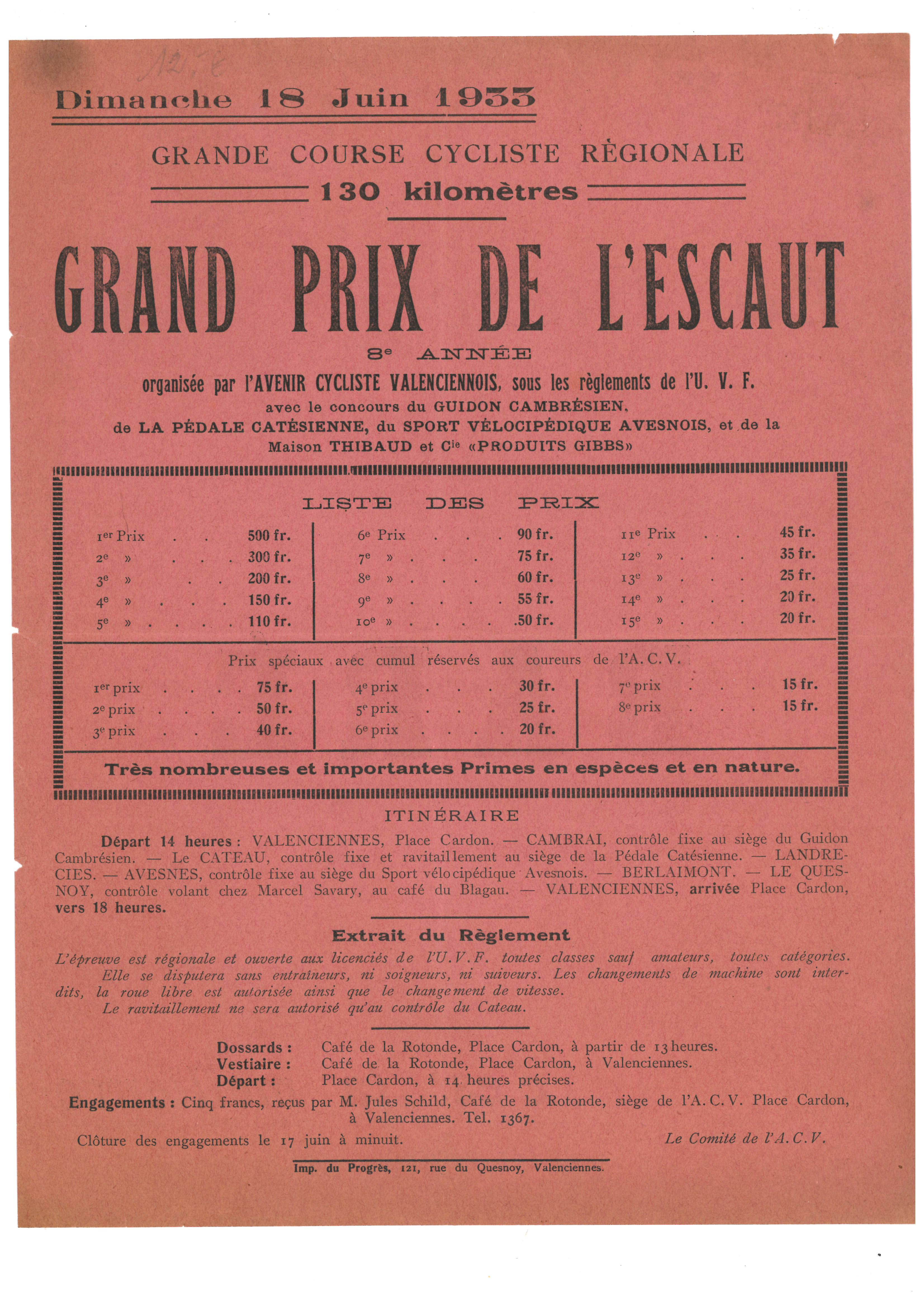 Affiche publicitaire du Grand prix de l'Escaut de 1933, sponsorié par la bière Baré au dos
