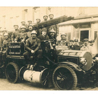 Pompiers posant sur un de leur véhicule, une autopompe Mieusset