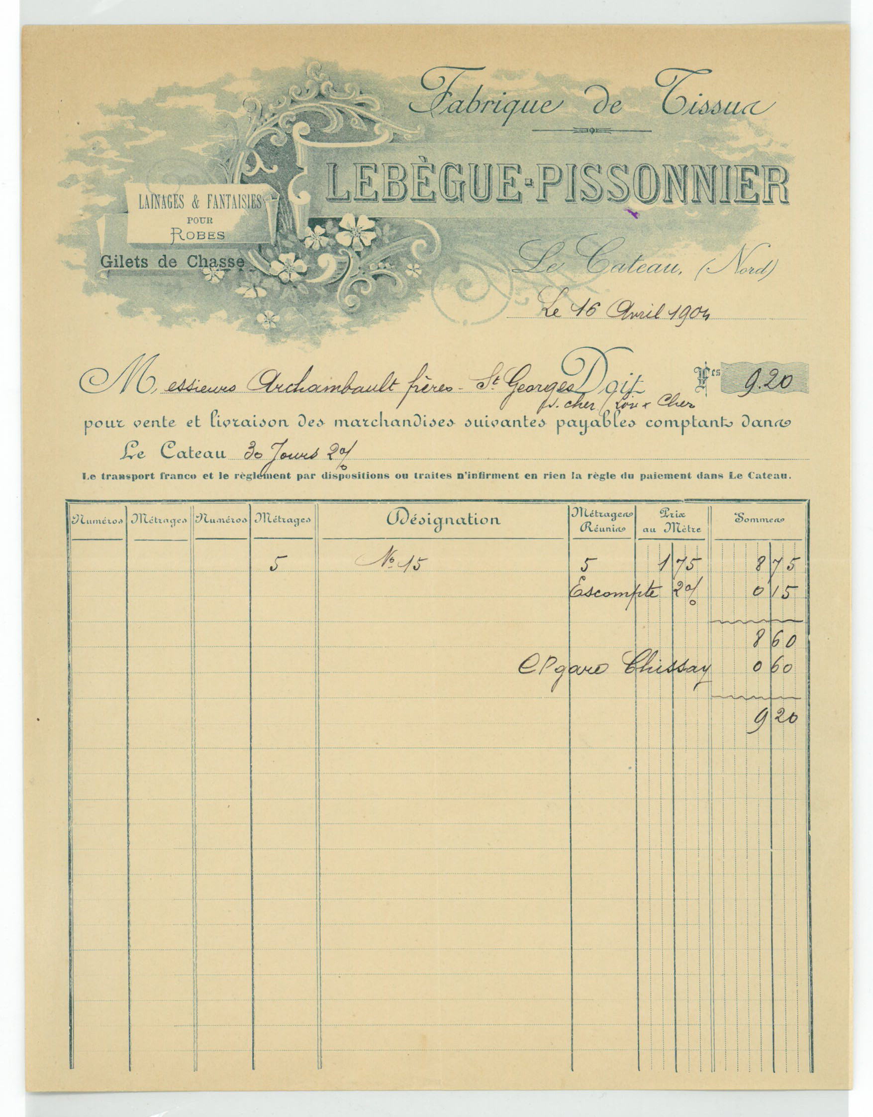 Une facture de la fabrique de tissus Lebègue-Pissonnier