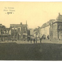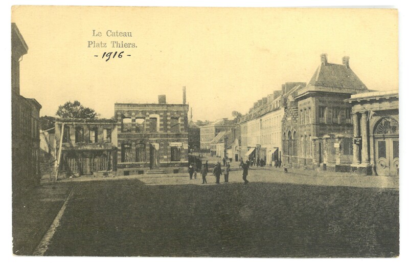 Un groupe de personne en bas de la Place Thiers face à la porte du Palais Fénelon avec intersection de la rue de la République et la rue Charles Seydoux