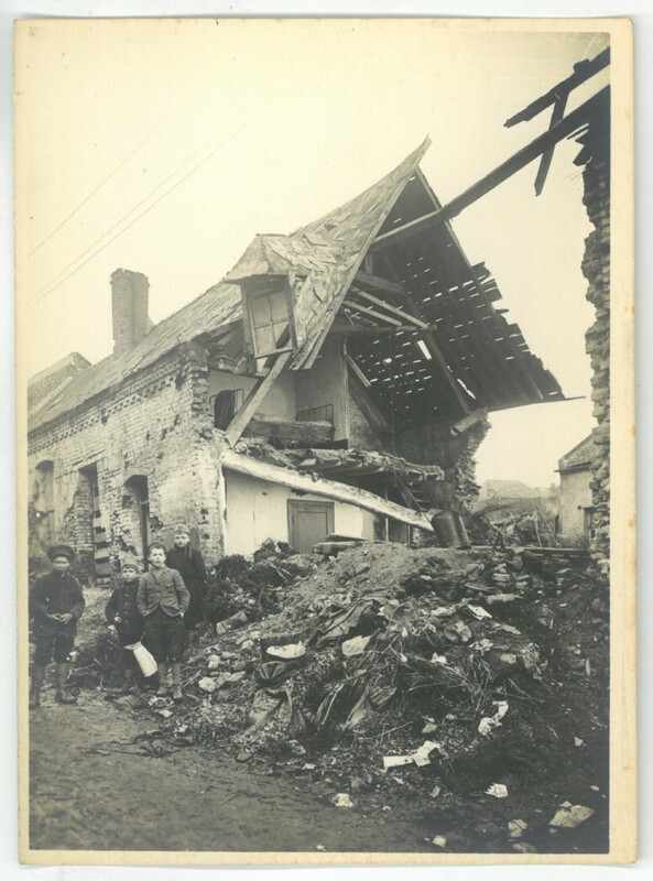 Un bâtiment dans une rue avec un groupe de jeunes détruit lors de la libération 1918.
