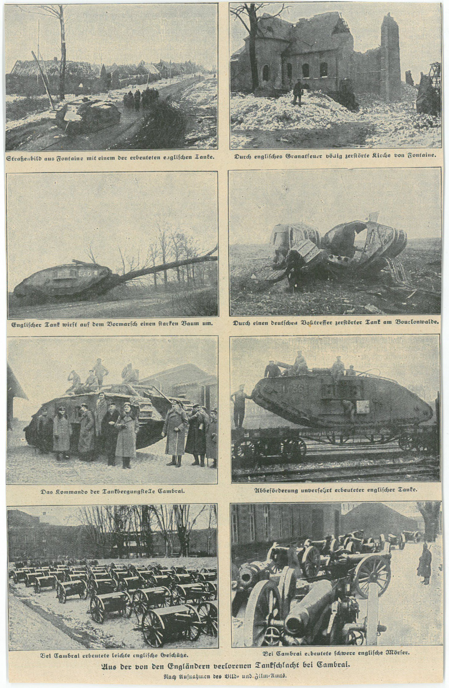 Coupure de presse contenant 8 photographies de chars après la bataille de Cambrai en décembre 1917