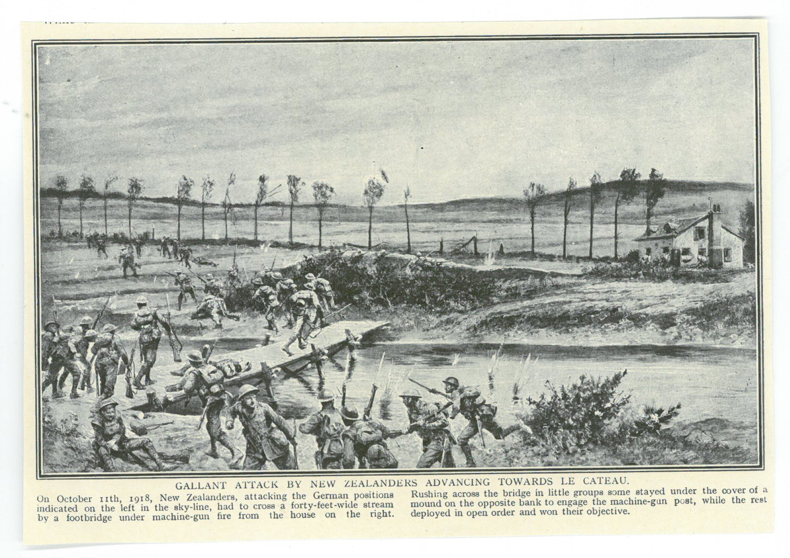Coupure de presse avec gravure représentant des soldats néo-zélandais avançant vers Le Cateau (11 octobre 1918)