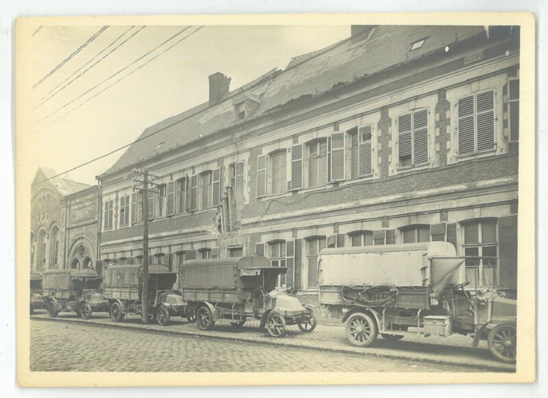 La maison des sœurs actuellement résidence Maréchal Mortier avec des camions anglais endommagée lors de la libération 1918.
