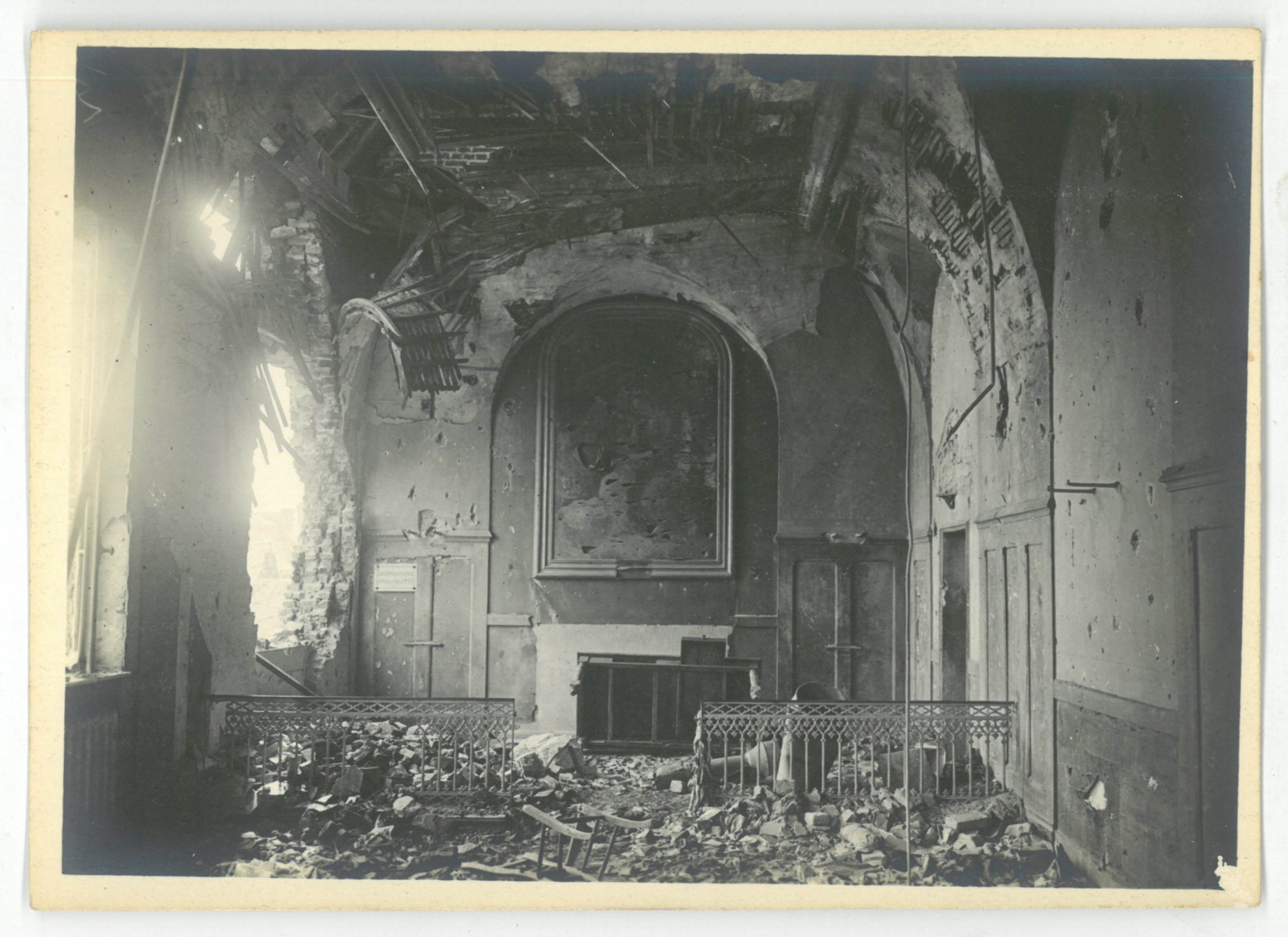 L' intérieur de la chapelle de l’Hôpital Paturle endommagé lors de la libération 1918.