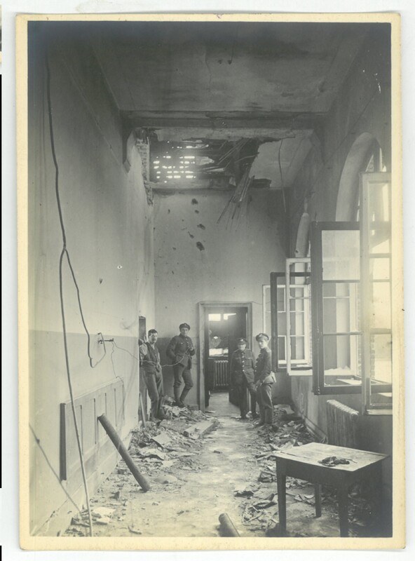 Le couloir de l’Hôpital avec des soldats anglais endommagé lors de la libération de 1918.