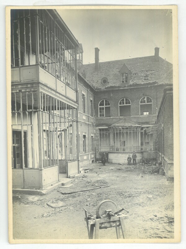 La cour extérieur avec au fond des enfants près de la verrière endommagée lors de la libération 1918.