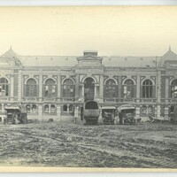 La façade de la salle des fêtes vue de l'extérieur avec cinq camions garés devant endommagée lors de la libération de 1918.
