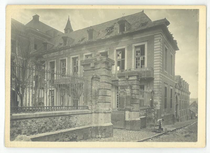L'entrée et la façade de l'école de garçons situé au collège endommagée lors de la libération 1918.