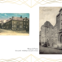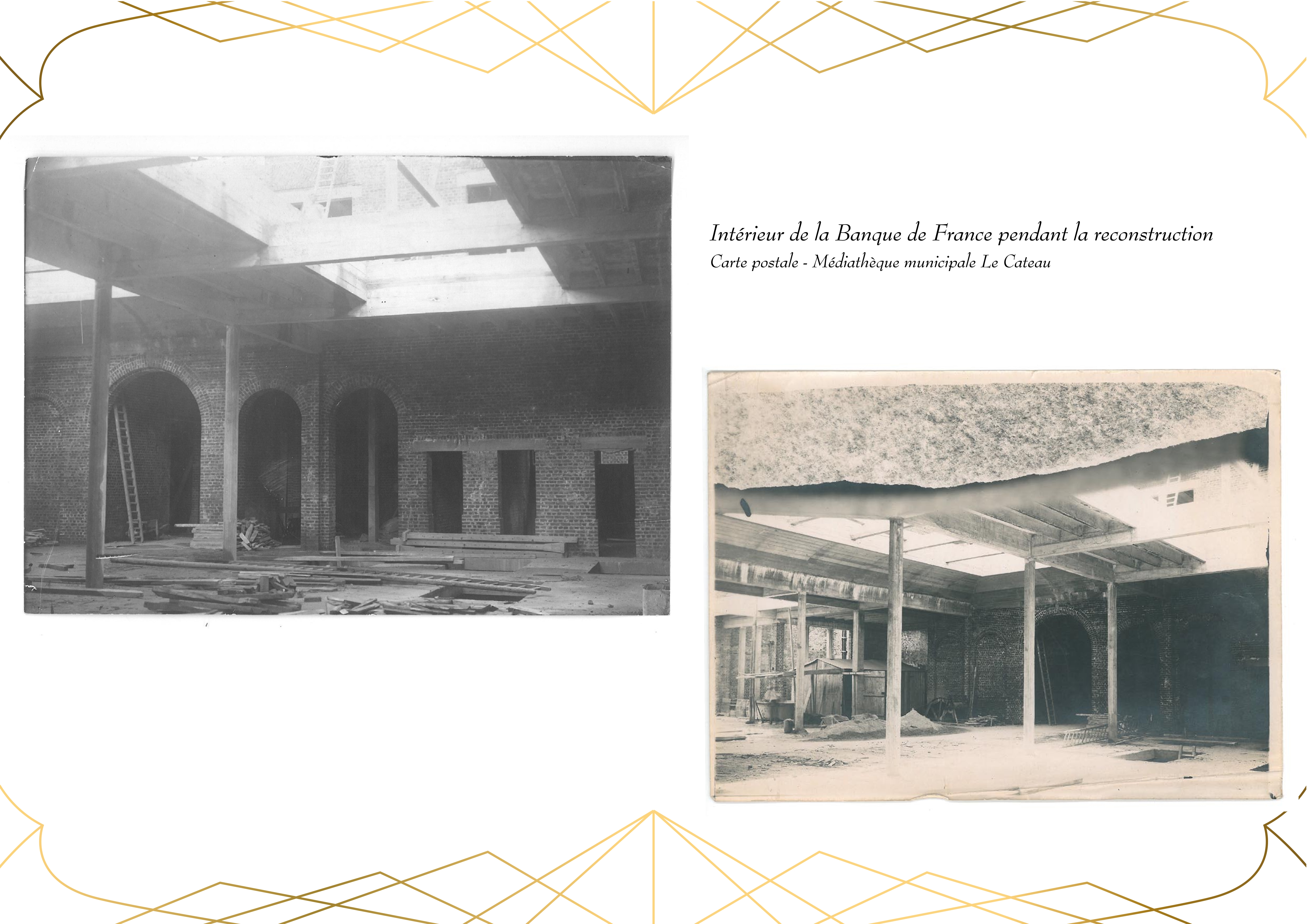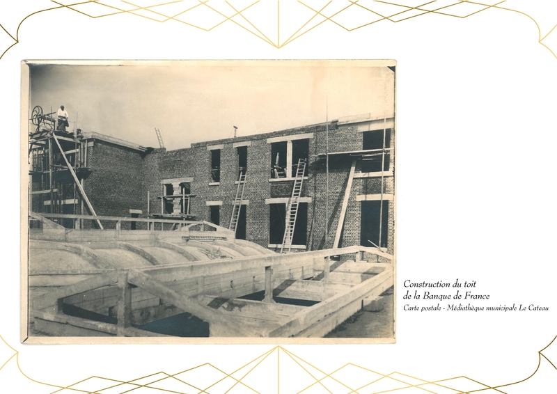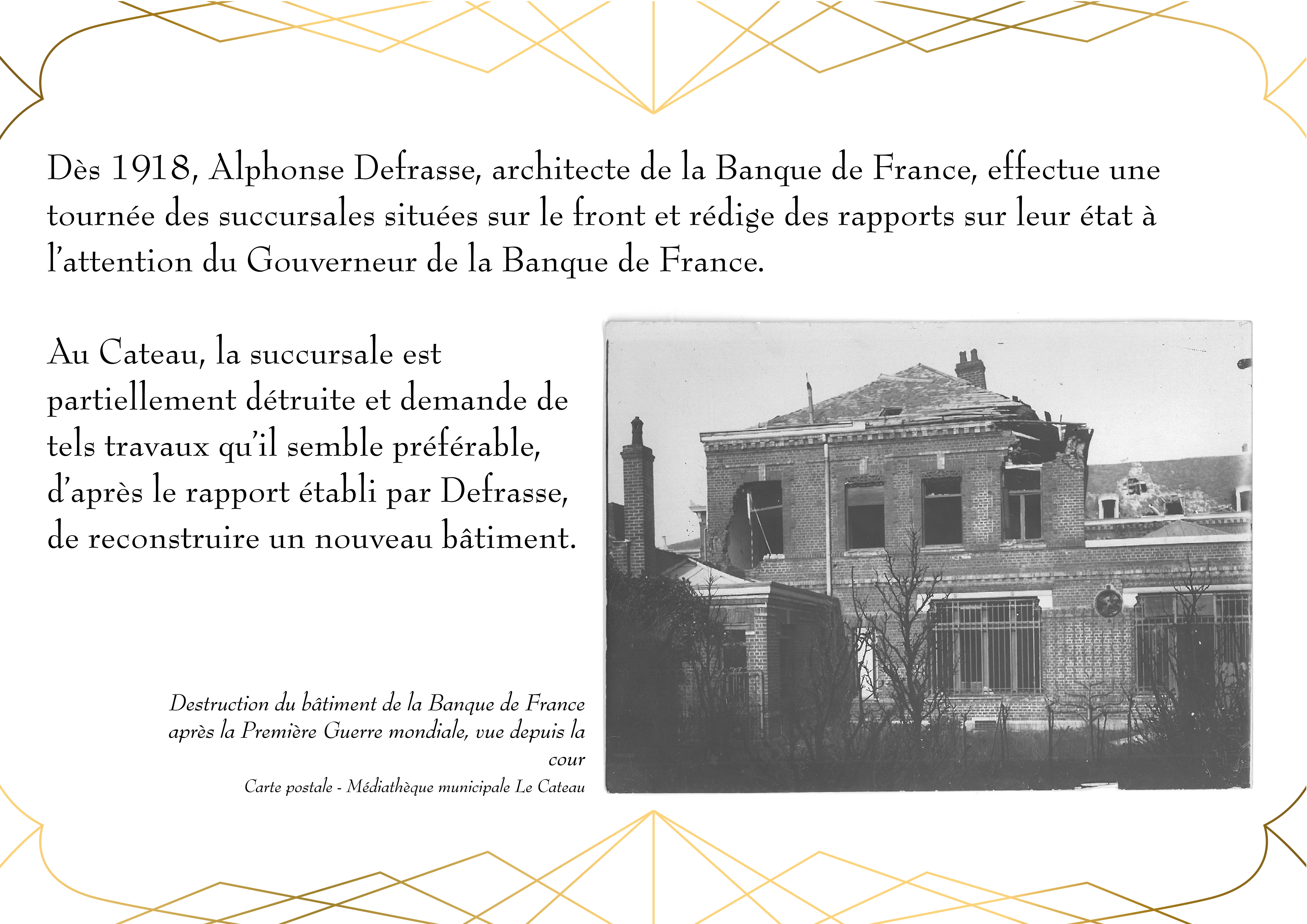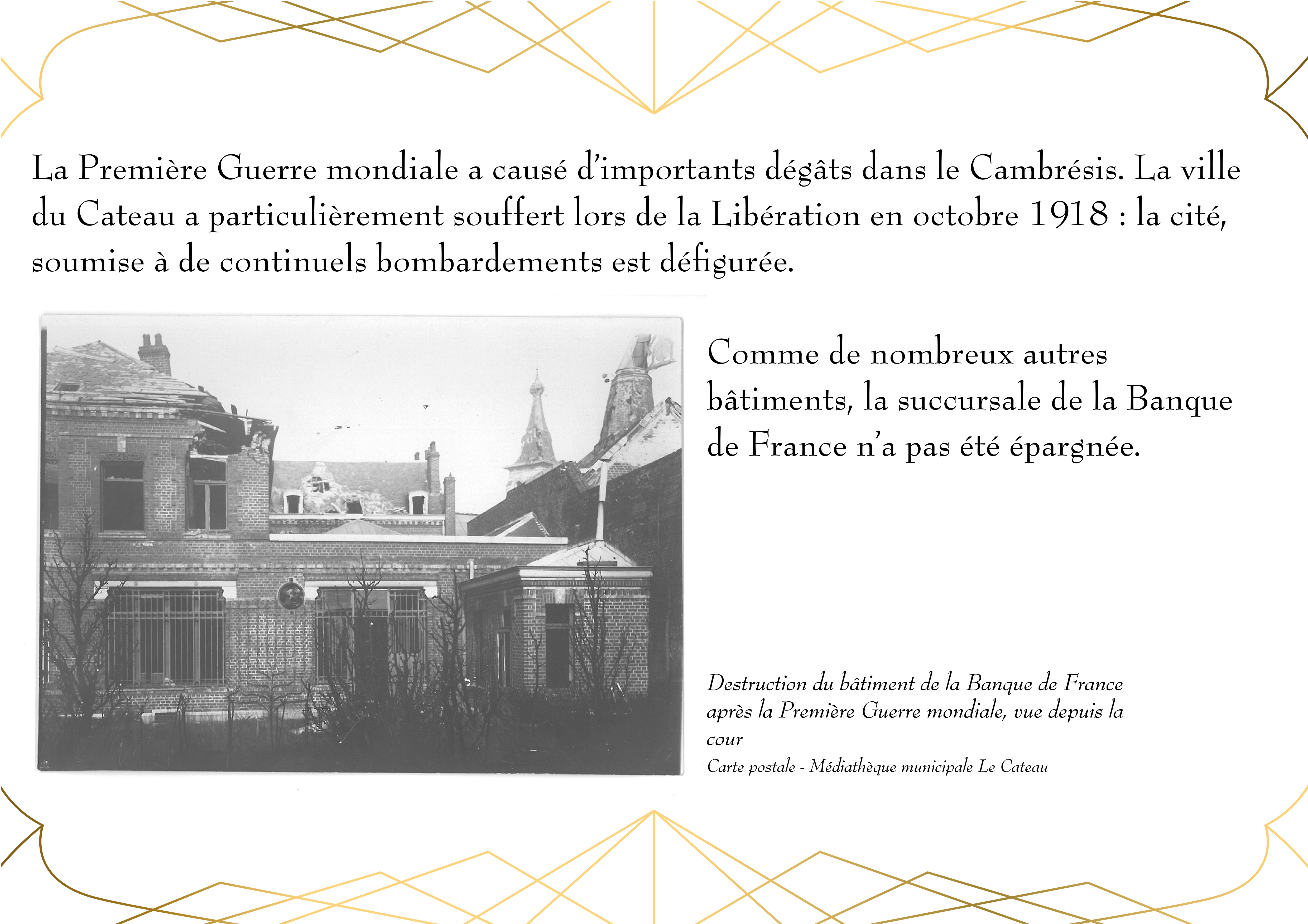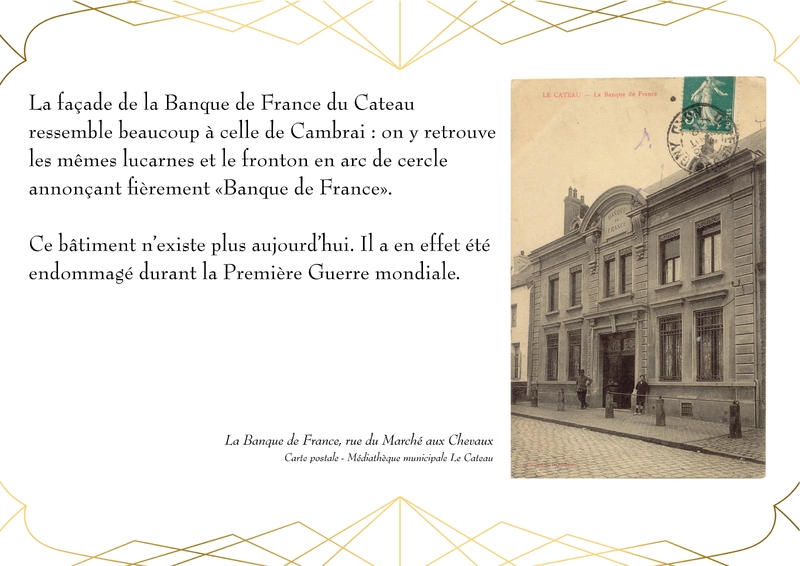 Entièrement détruit lors de la libéraion de la ville en 1918, Le bâtiment de la Banque de France, qui abrite actuellement la Médiathèque du Cateau, est rénové en 1920.