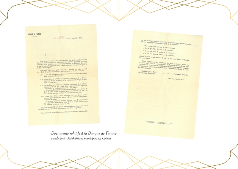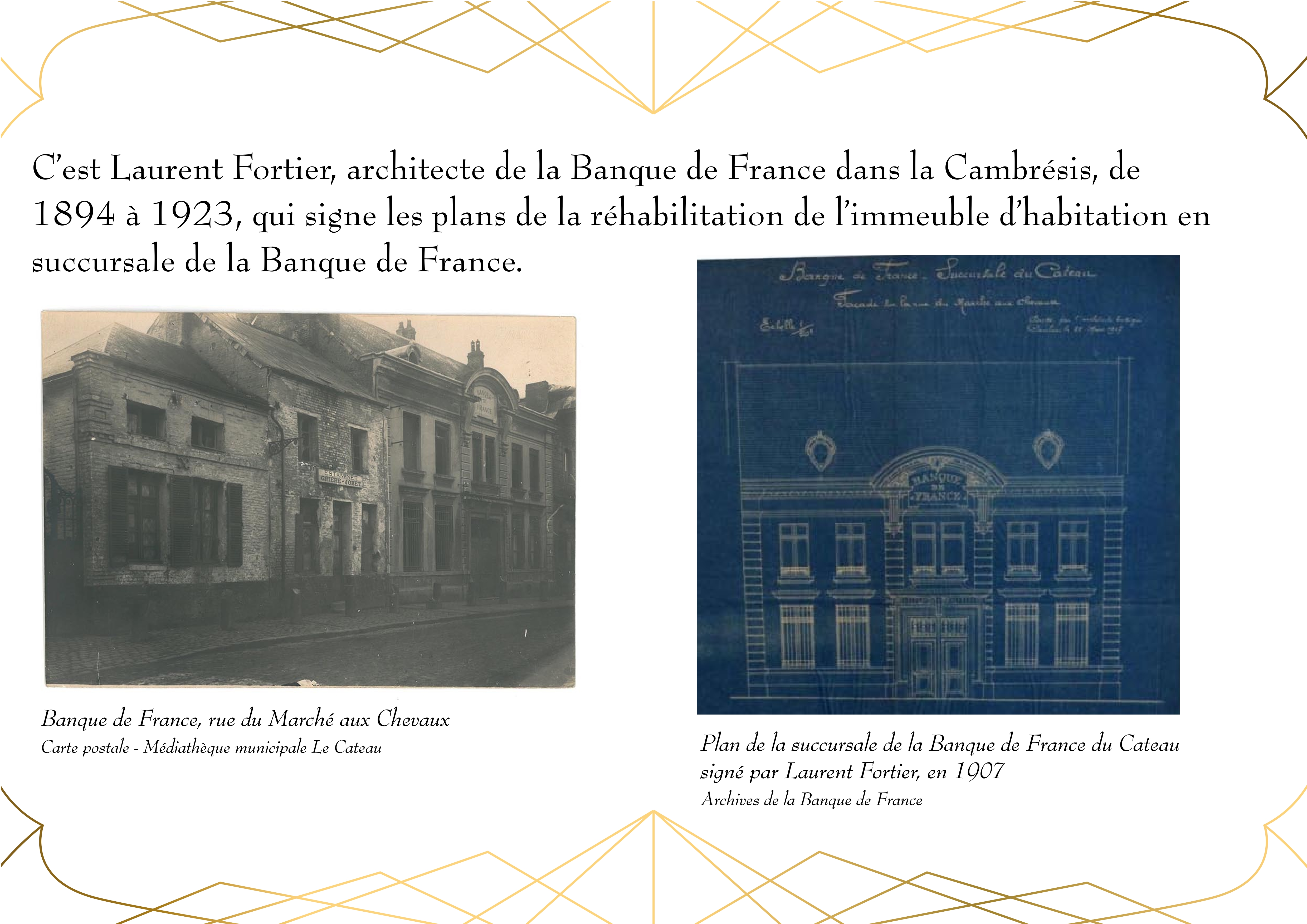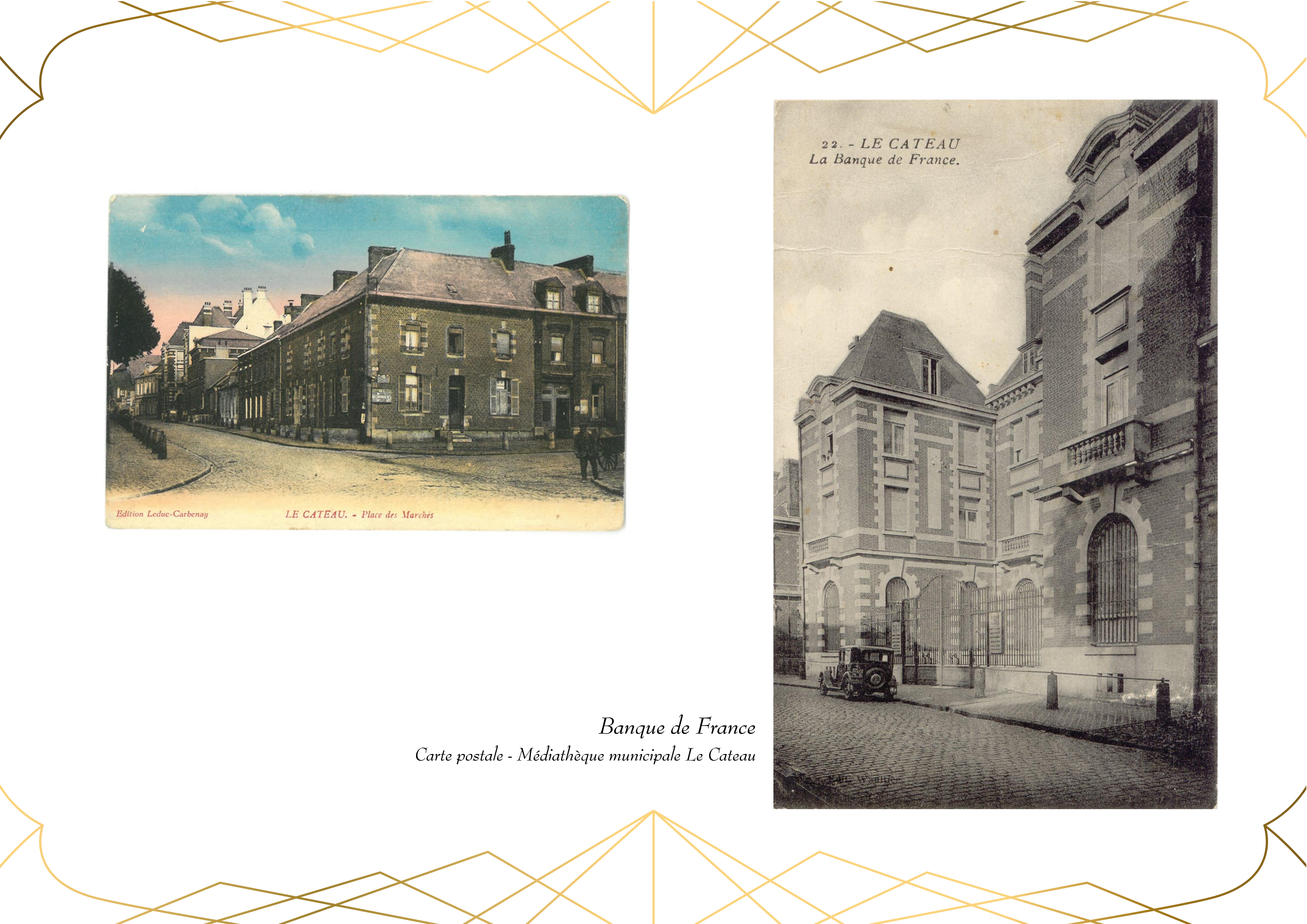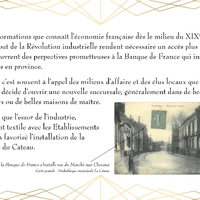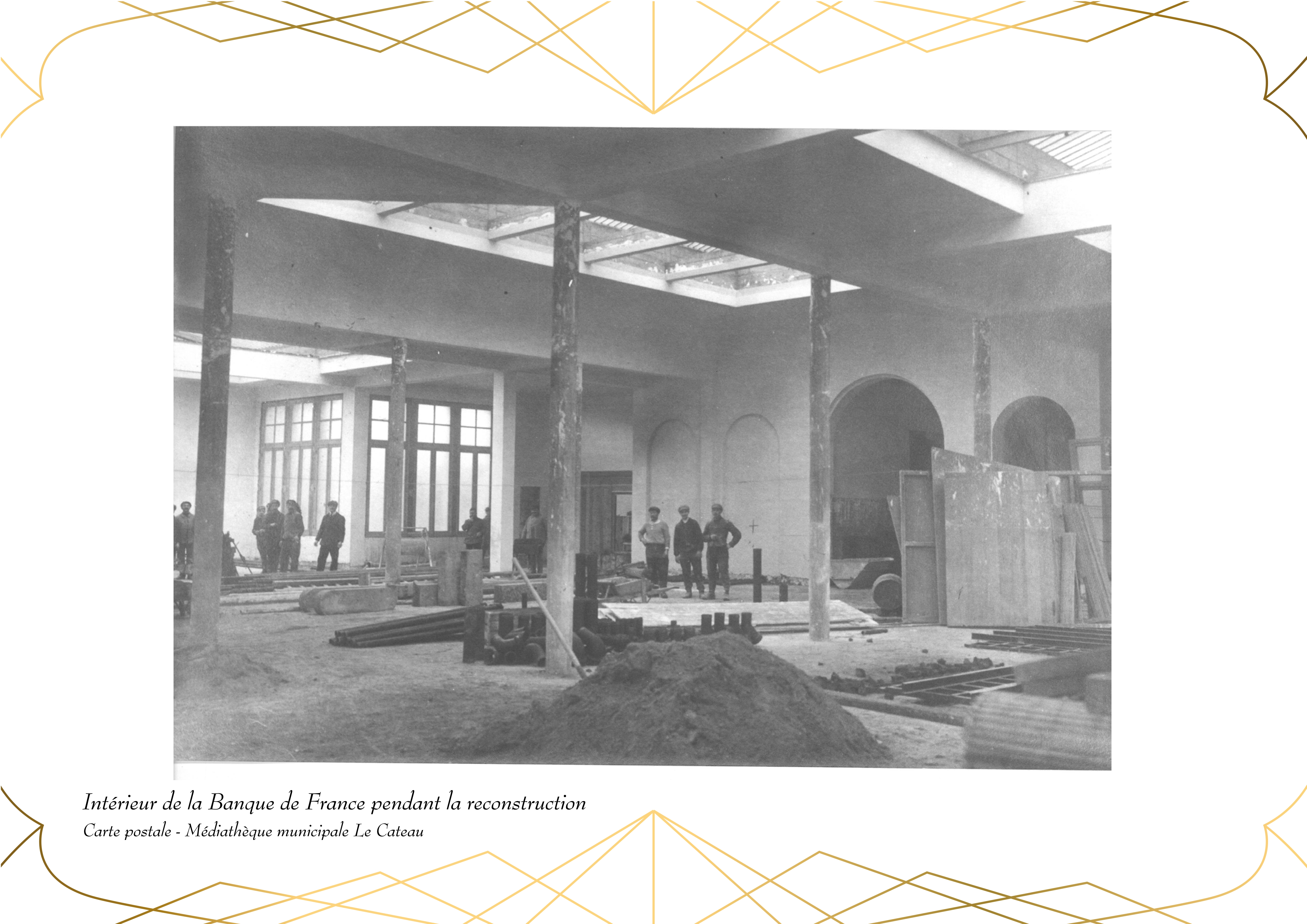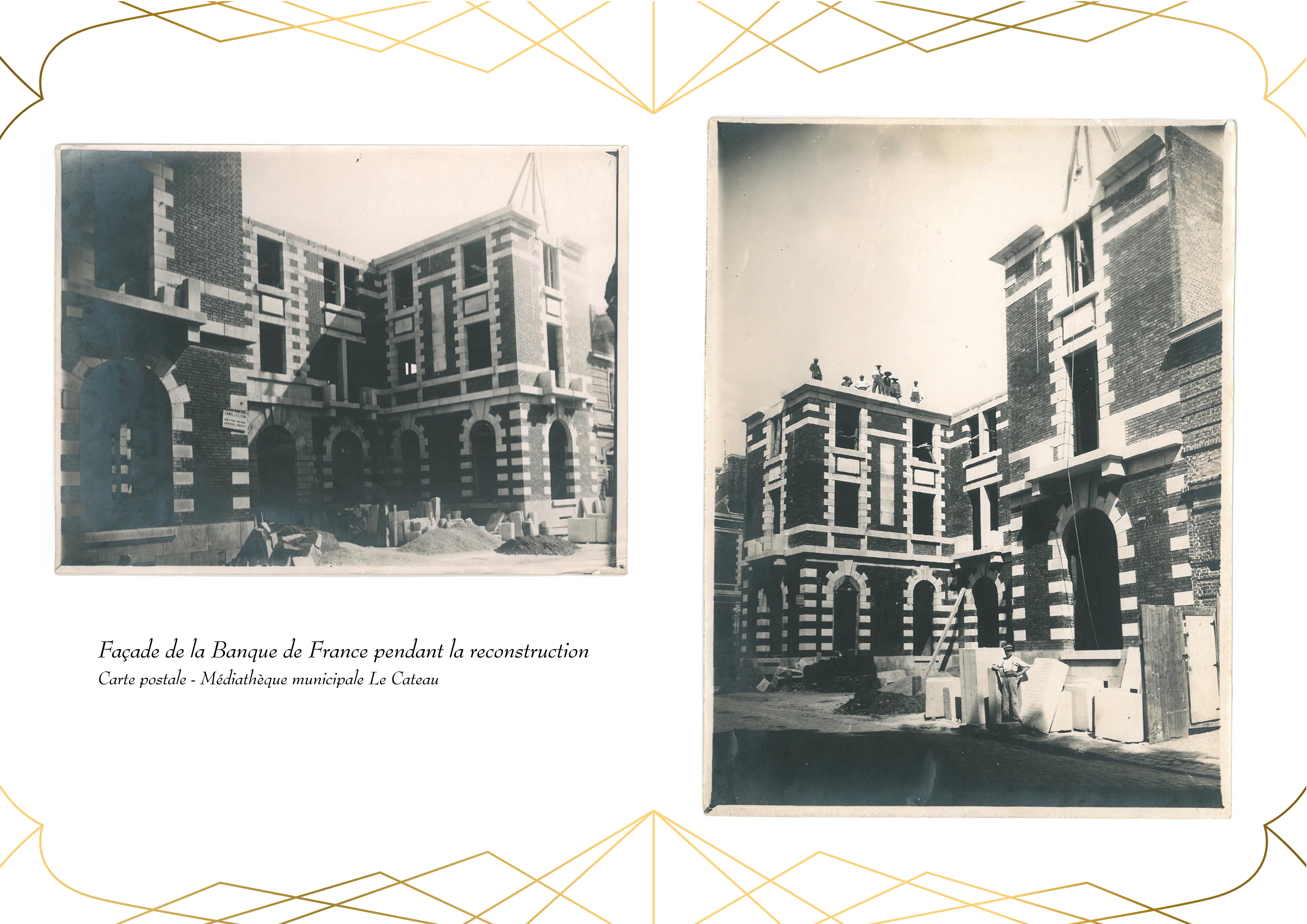 Entièrement détruit lors de la libéraion de la ville en 1918, Le bâtiment de la Banque de France, qui abrite actuellement la Médiathèque du Cateau, est rénové en 1920.