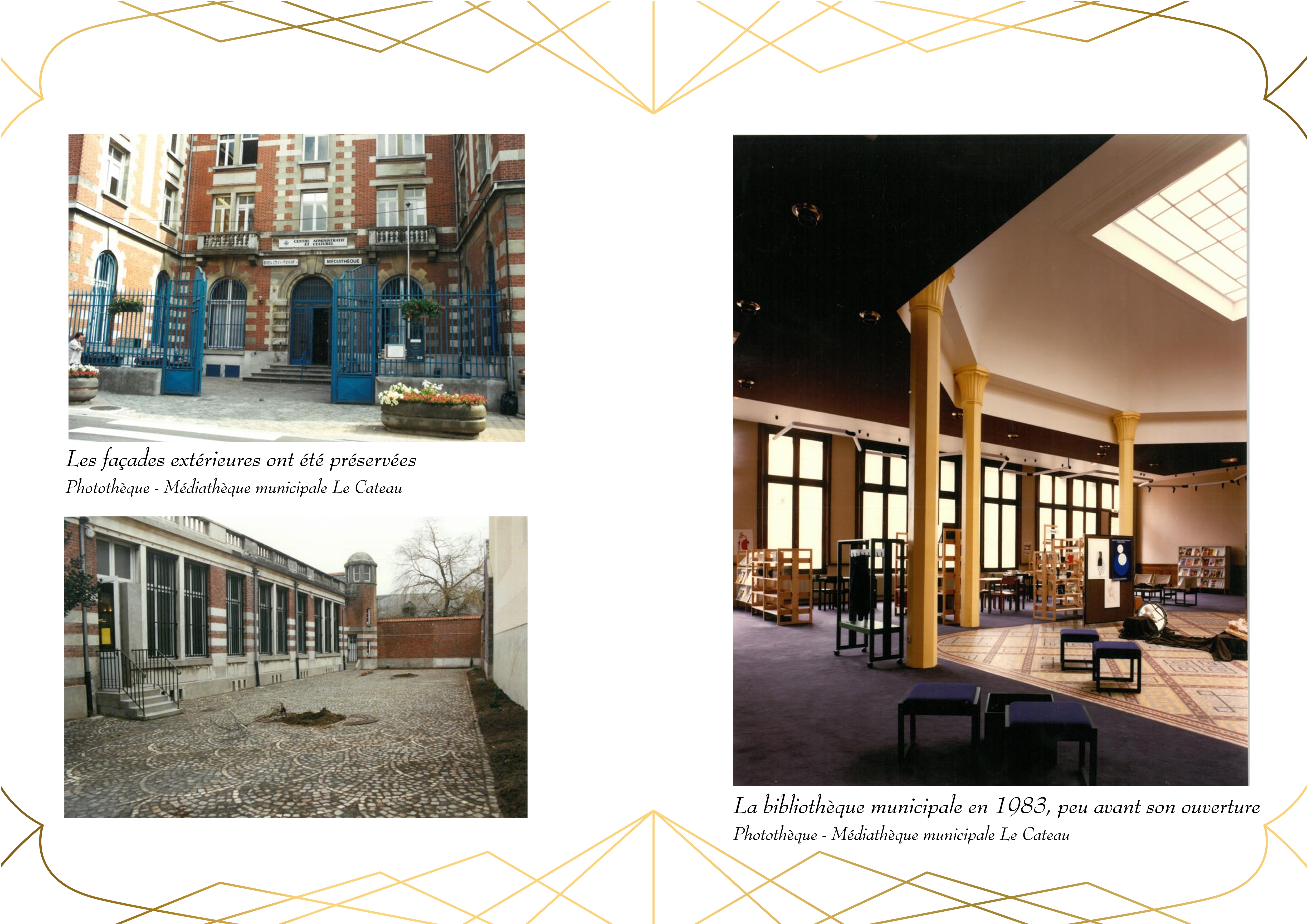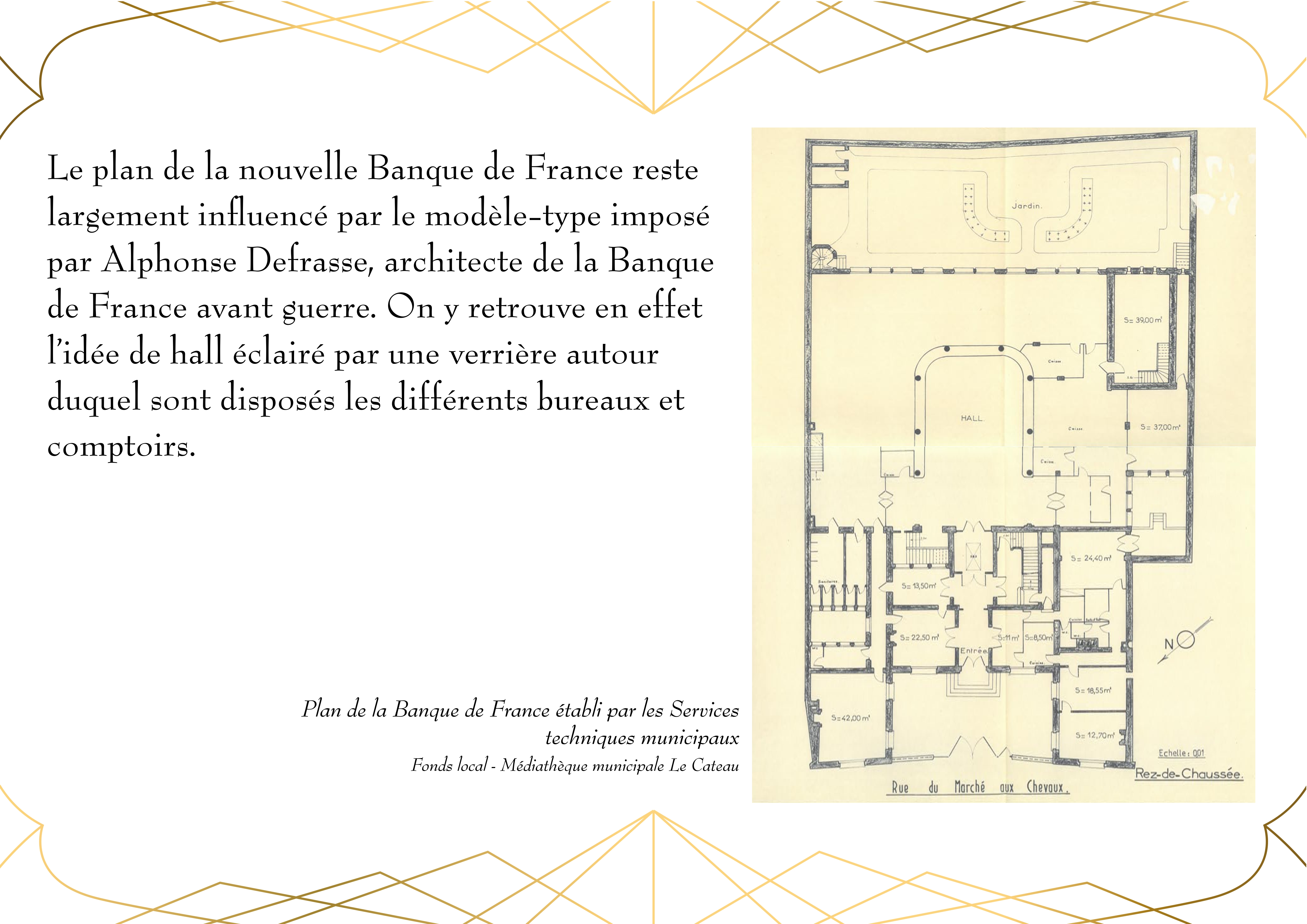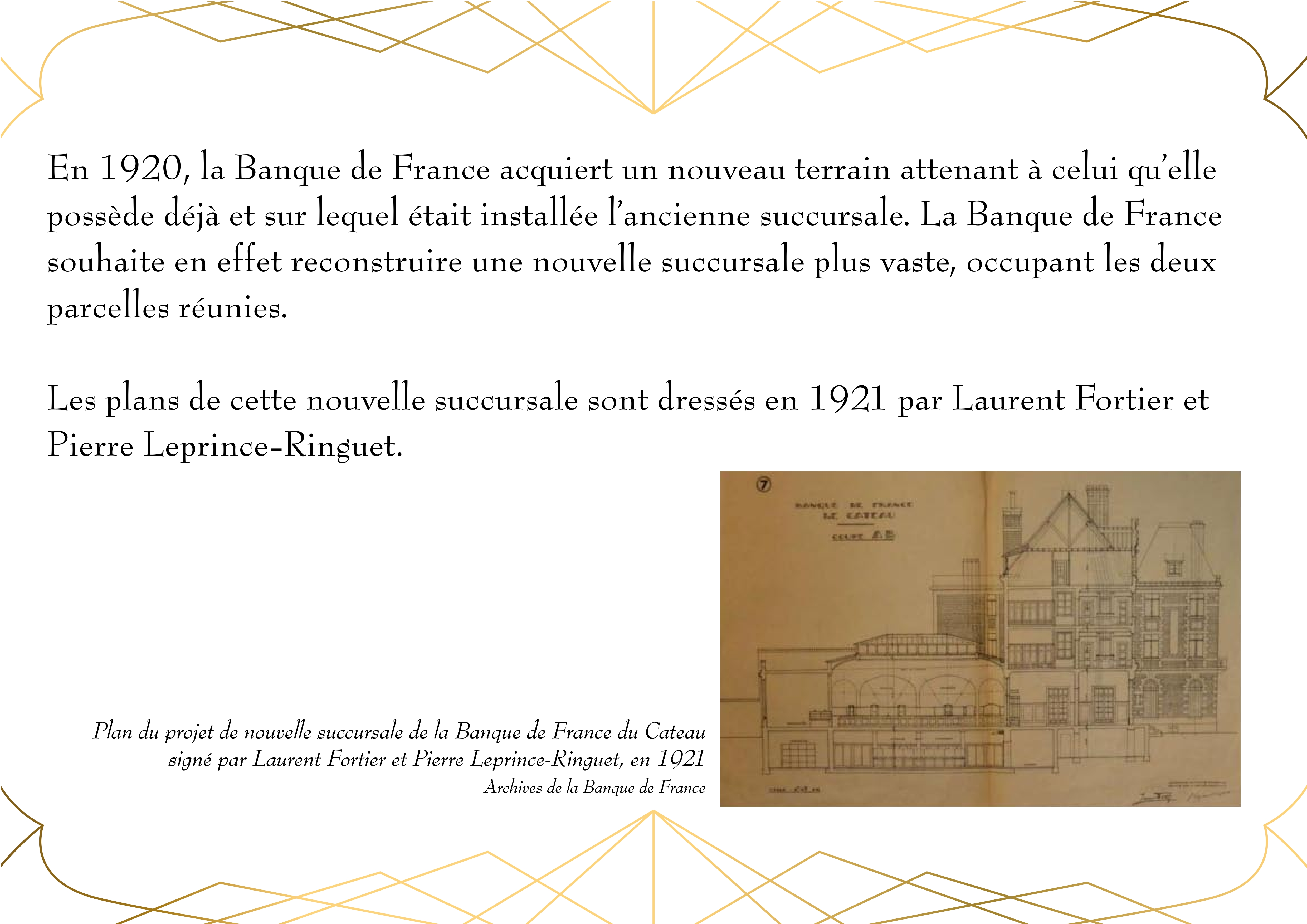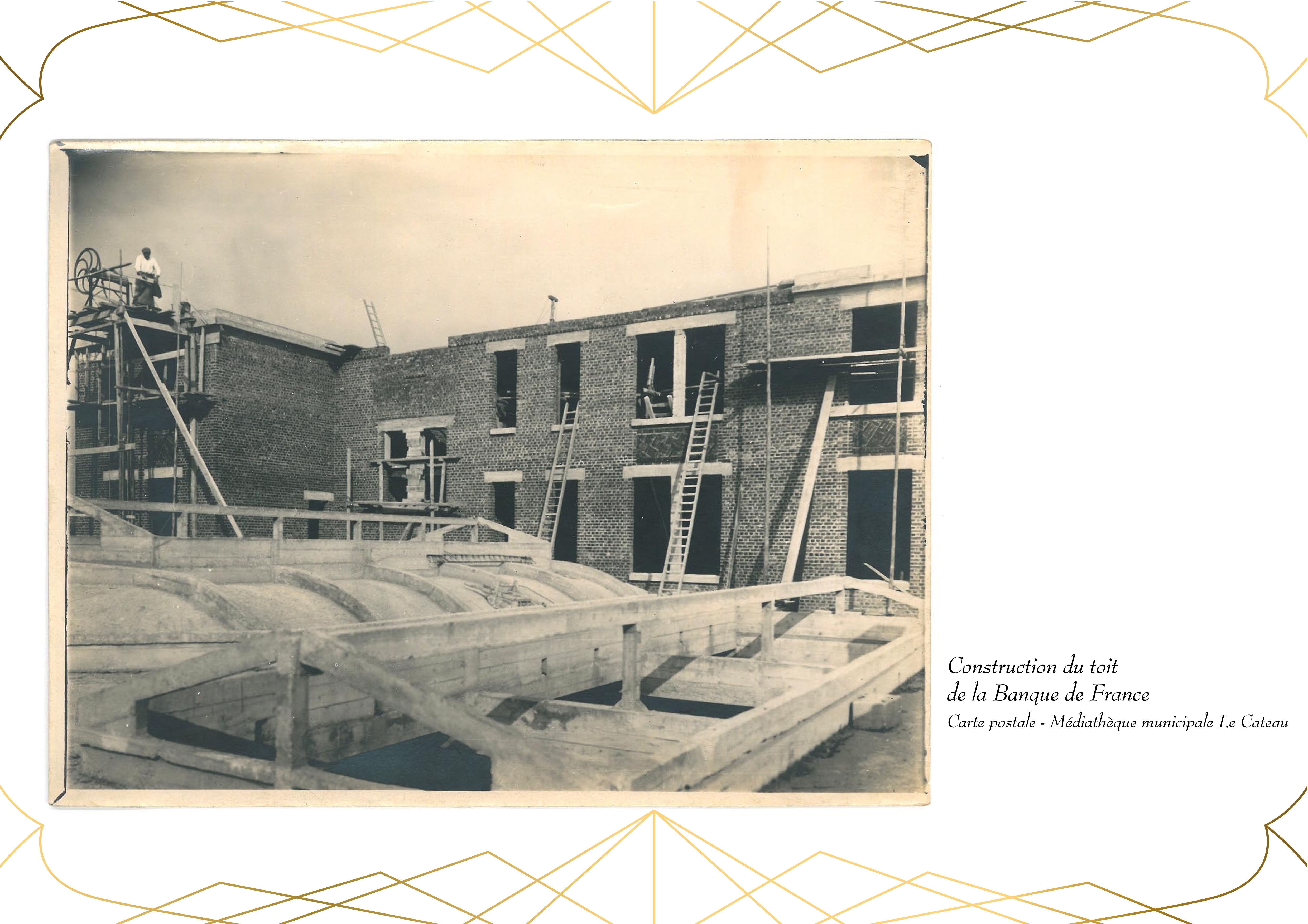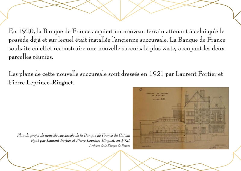 Entièrement détruit lors de la libéraion de la ville en 1918, Le bâtiment de la Banque de France, qui abrite actuellement la Médiathèque du Cateau, est rénové en 1920.