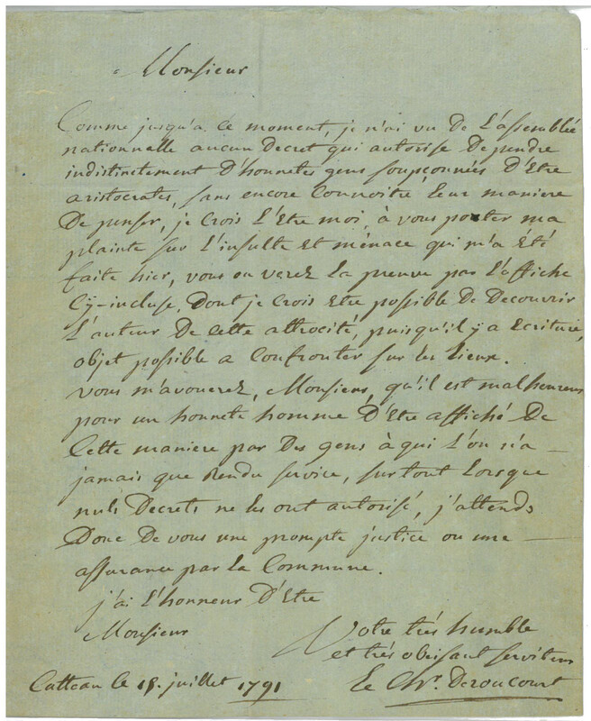 "Comme jusqu'à ce moment je n'ai vu de l'assemblée nationale(sic) aucun décret qui autorise de pendre indistinctement d'honnêtes gens soupçonnés d'être aristocrates.. je crois l'être moi, à vous porter ma plainte sur l'insulte et menace qui m'a été faite hier... Vous m'avouerez Monsieur, qu'il est malheureux pour un honnête homme d'être affcihé de cette manière..."