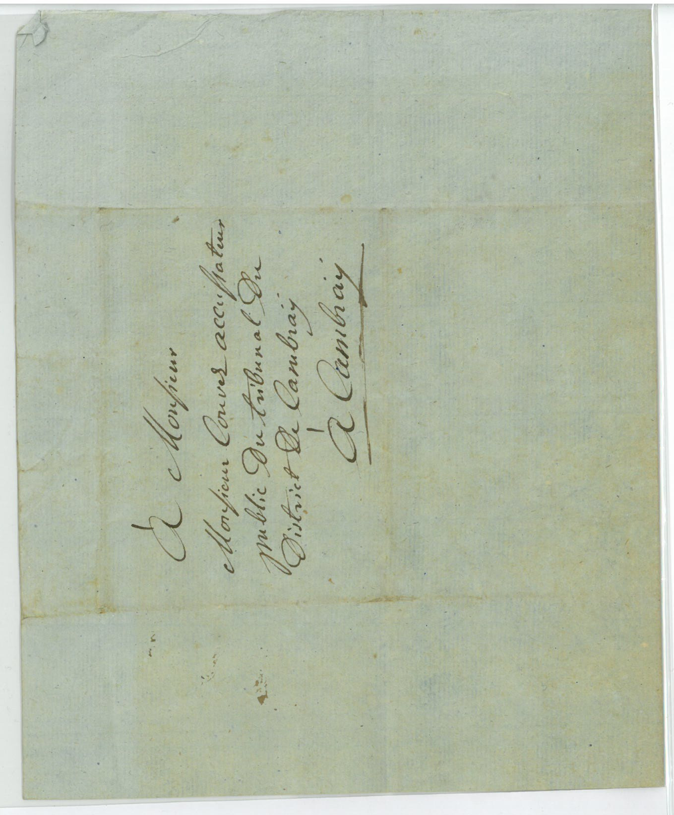 L'accusateur public Toussaint Convey expose l'affaire dans une lettre aux "présidents et juges du districts de Cambrai", suivie du procès-verbal de réception de la plainte et de 8 signatures.