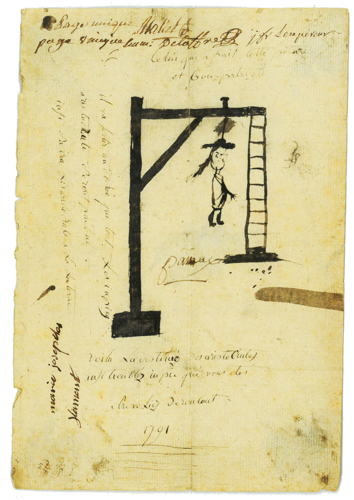 Ce ci-devant noble catésien se plaint des menaces reçues la veille sous forme d'une lettre anonyme ornée d'un dessin le représntant.. pendu!