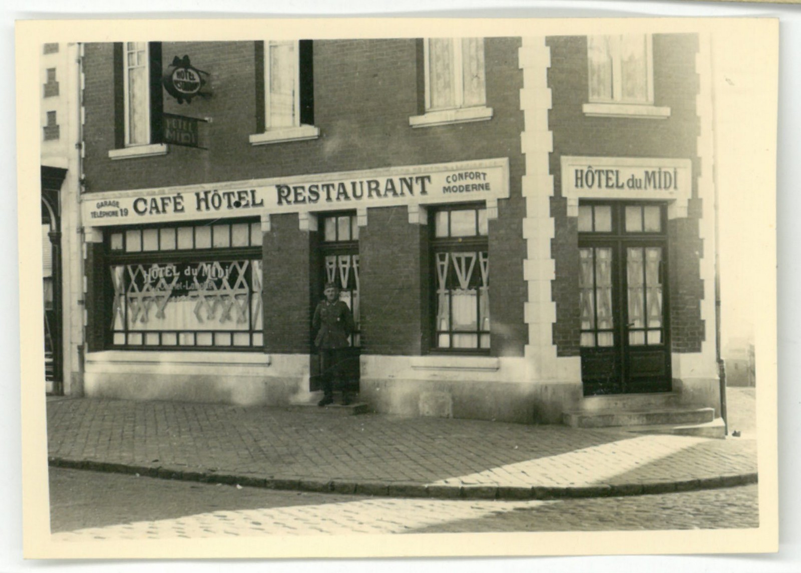 Soldat allemand posant devant Hôtel du Midi durant l'Occupation de la Seconde Guerre mondiale