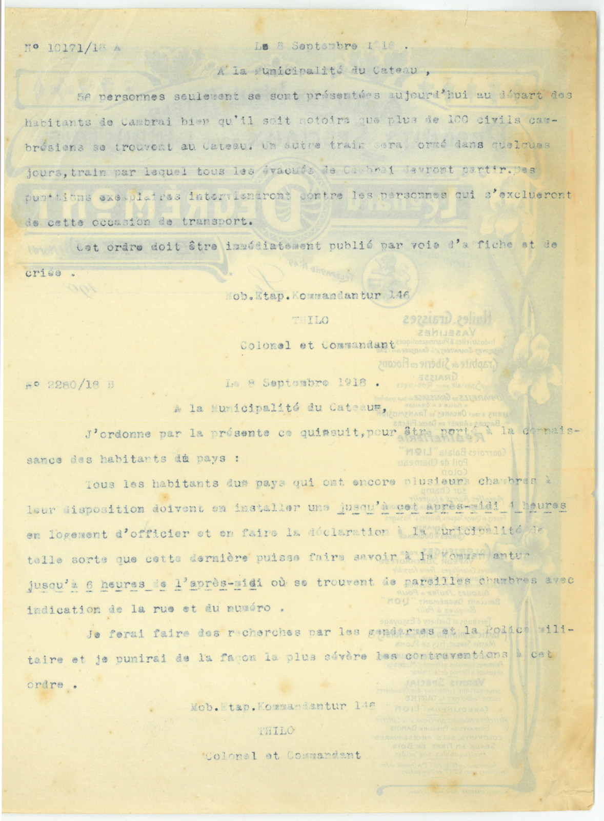 Ordre de réquisition des chambres de la Kommandantur le 8 septembre 1918