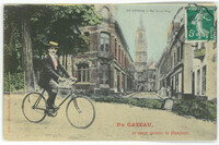 Un homme élégant sur son vélo avec vue sur la rue Victor Hugo et le Beffroi au fondCréateur : Lafinneur Samin (Editeur)Date : 19..Type : Image, Image fixe, PhotographieMots‑clés : Hôtel de ville / Beffroi, Patrimoine bâti, Tourisme, Carte postale allemande -