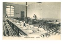 Carte postale ancienne montrant le réfectoire du lycée du Cateau, avec plusieurs tables dressées et des bouteilles de vin servies aux élèves.Type : Carte postale, PhotographieMots‑clés : Éducation - Écoles, Fonds Gérard Lemoine, Carte postale allemande -