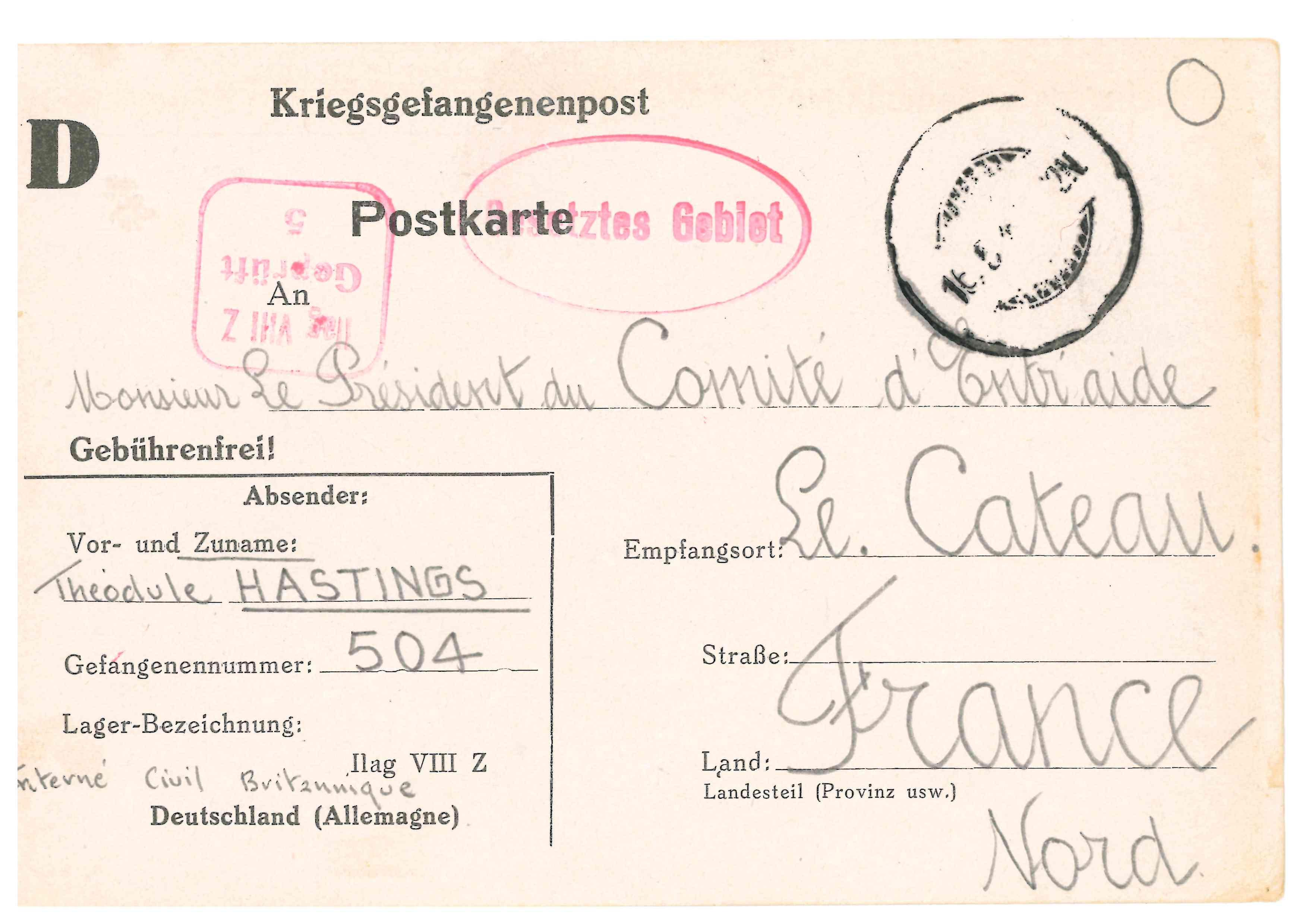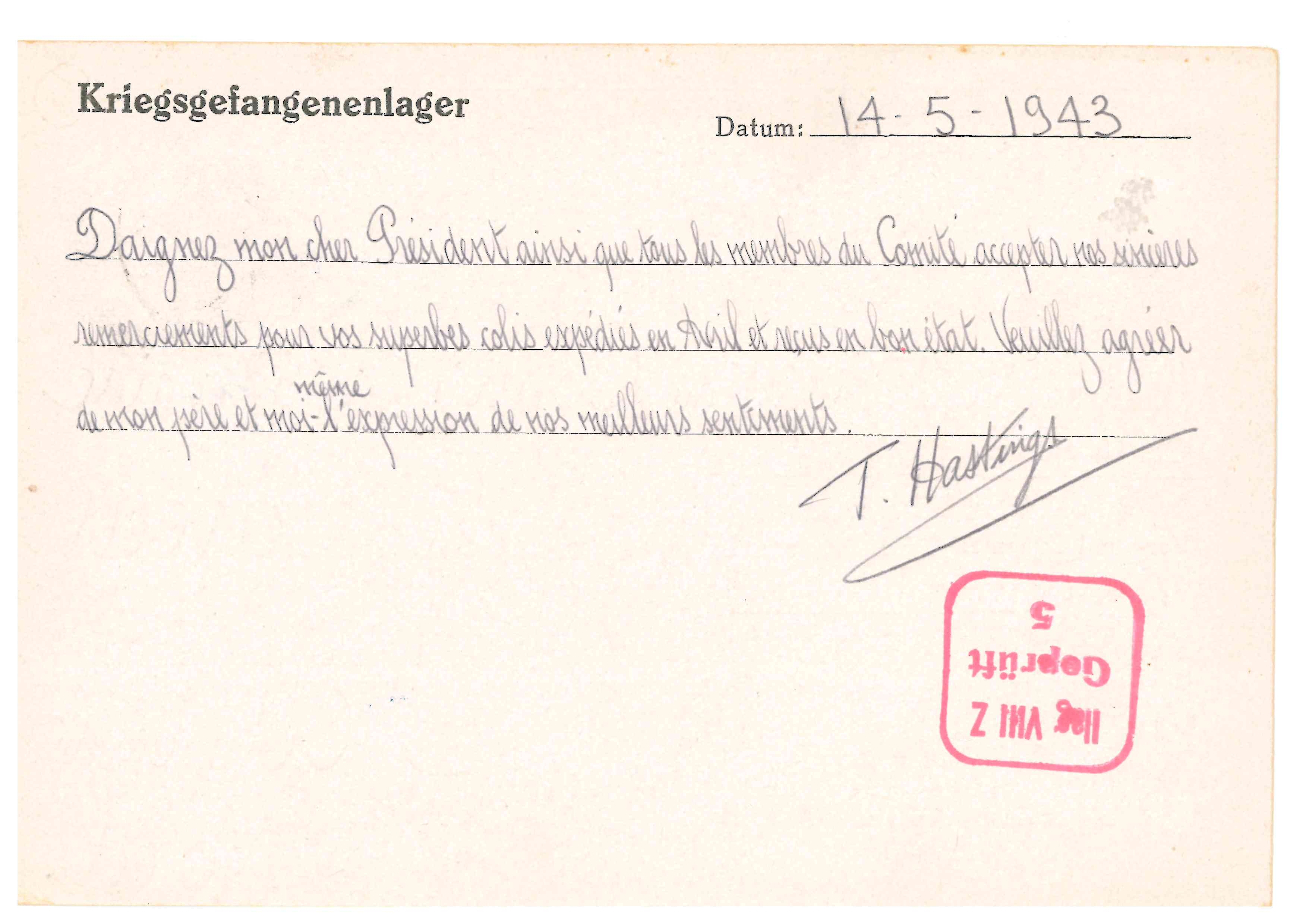Remerciement d'un interné Britannique adressé au Président du Comité d'Entraide du Cateau pour l'aide apportée.