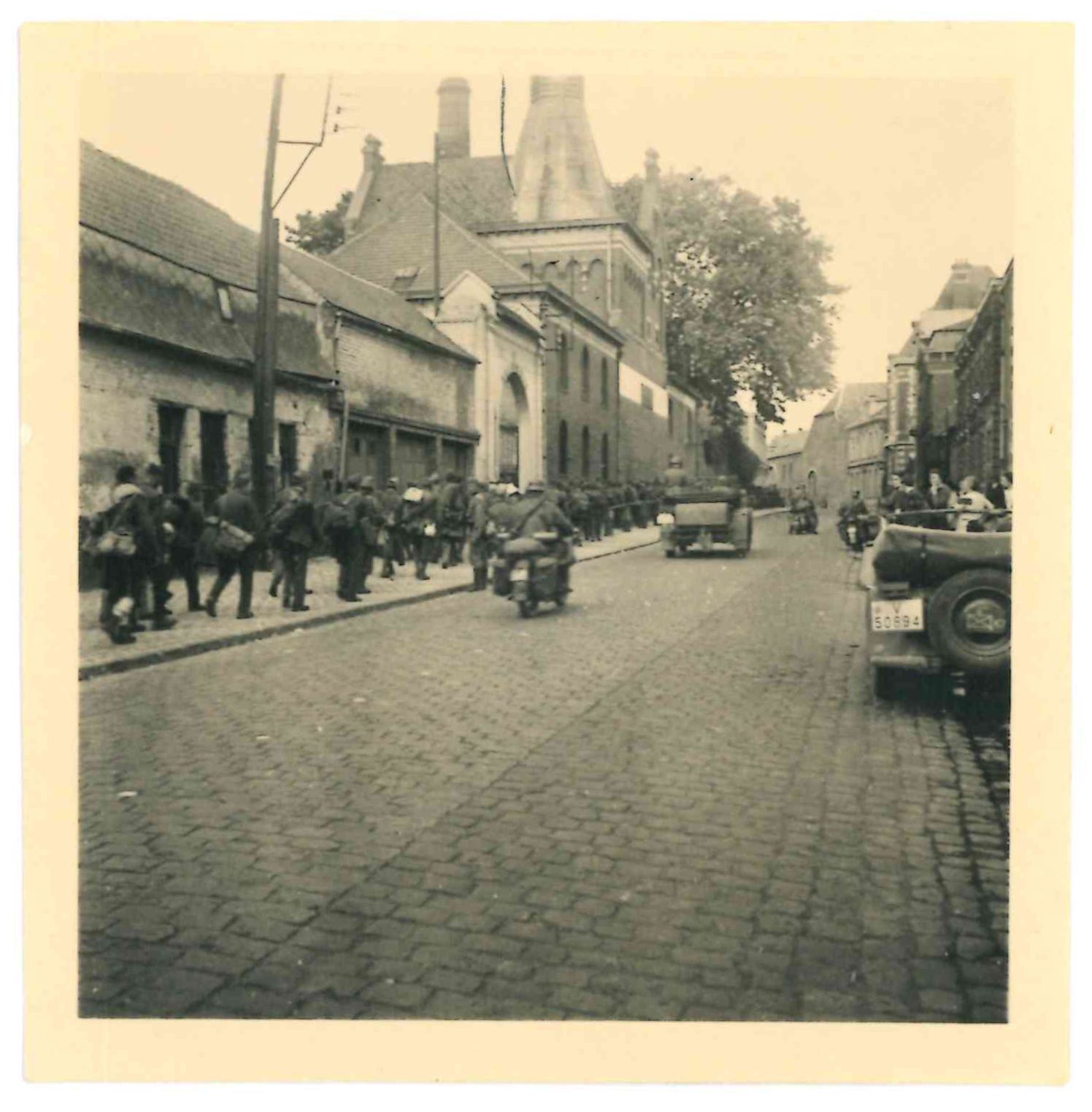 Colonne de soldats français prisonniers traversant Le Cateau en 1940
