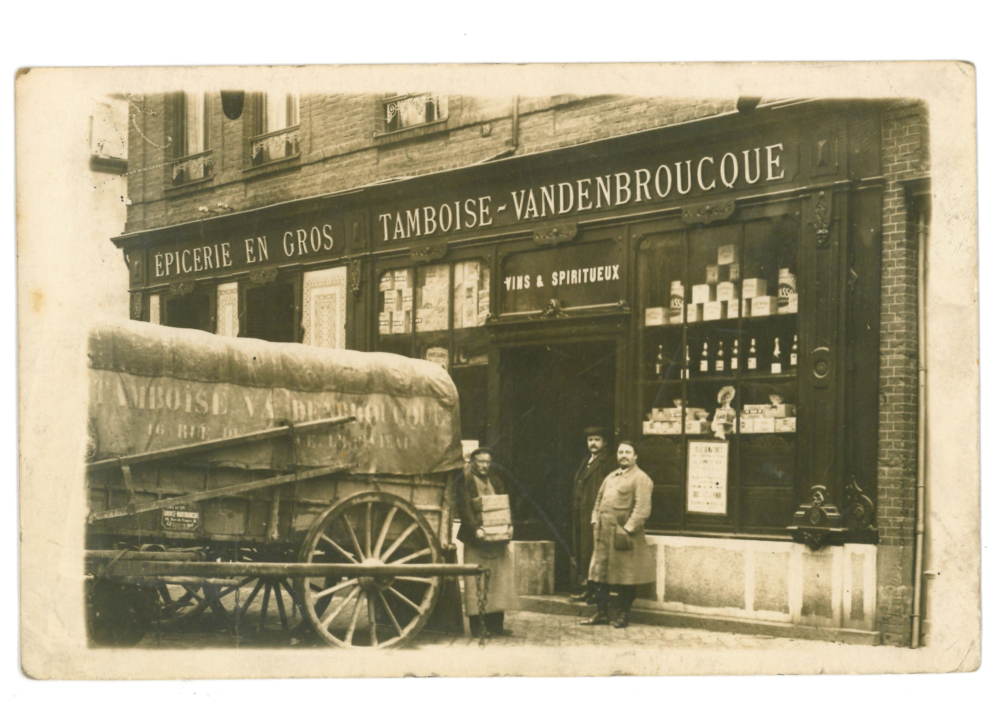 Façace de l'Epicerie Tamboise avec charrette à cheval de livraison au Cateau
