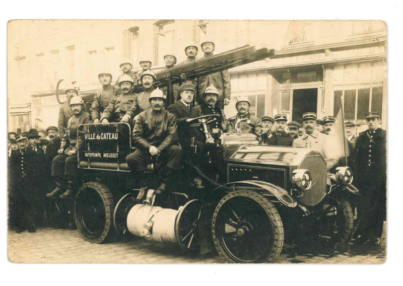 Pompiers posant sur un de leur véhicule, une autopompe Mieusset