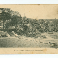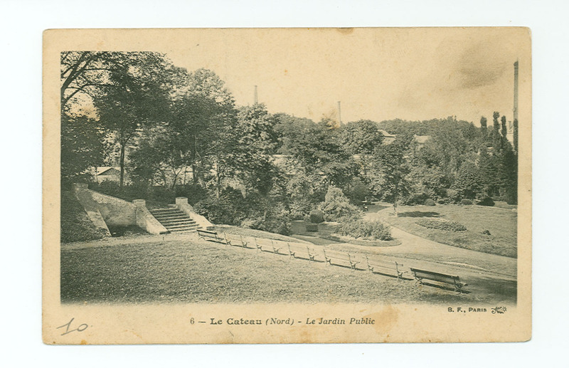 Le jardin public avec ses bancs face au parc et au fond les usines Seydoux.