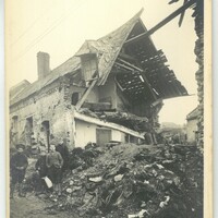 Un bâtiment dans une rue avec un groupe de jeunes détruit lors de la libération 1918.