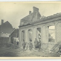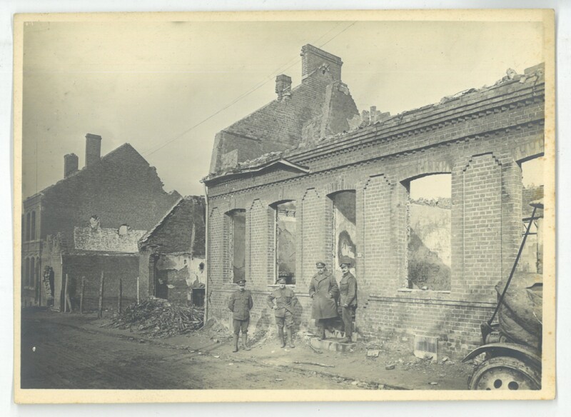 Un bâtiment avec des soldats anglais endommagé lors de la libération 1918.