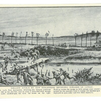 Coupure de presse avec gravure représentant des soldats néo-zélandais avançant vers Le Cateau (11 octobre 1918)