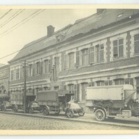 La maison des sœurs actuellement résidence Maréchal Mortier avec des camions anglais endommagée lors de la libération 1918.