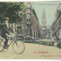 Un homme élégant sur son vélo avec vue sur la rue Victor Hugo et le Beffroi au fond