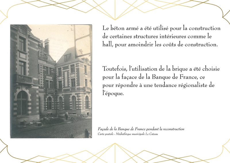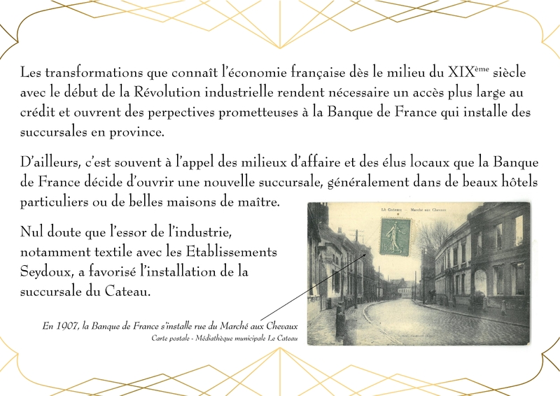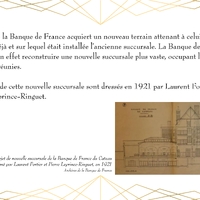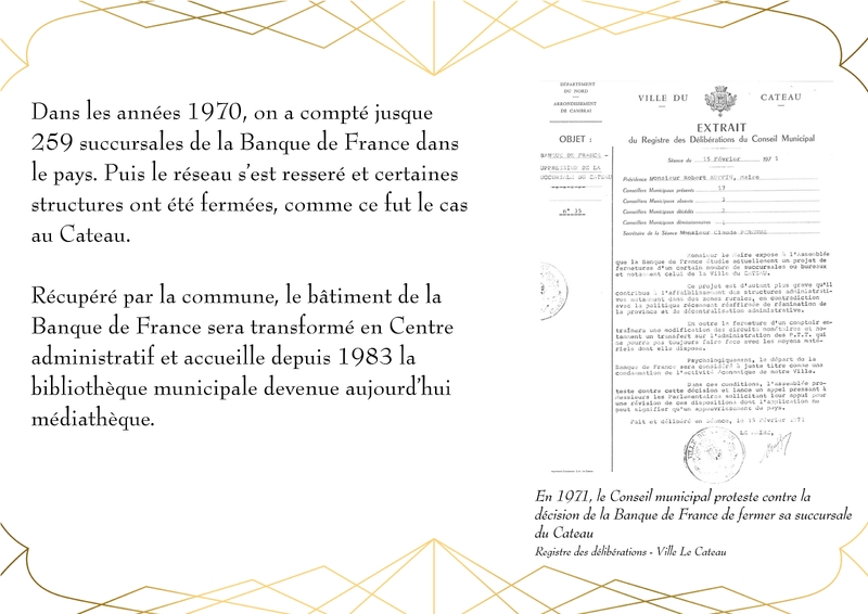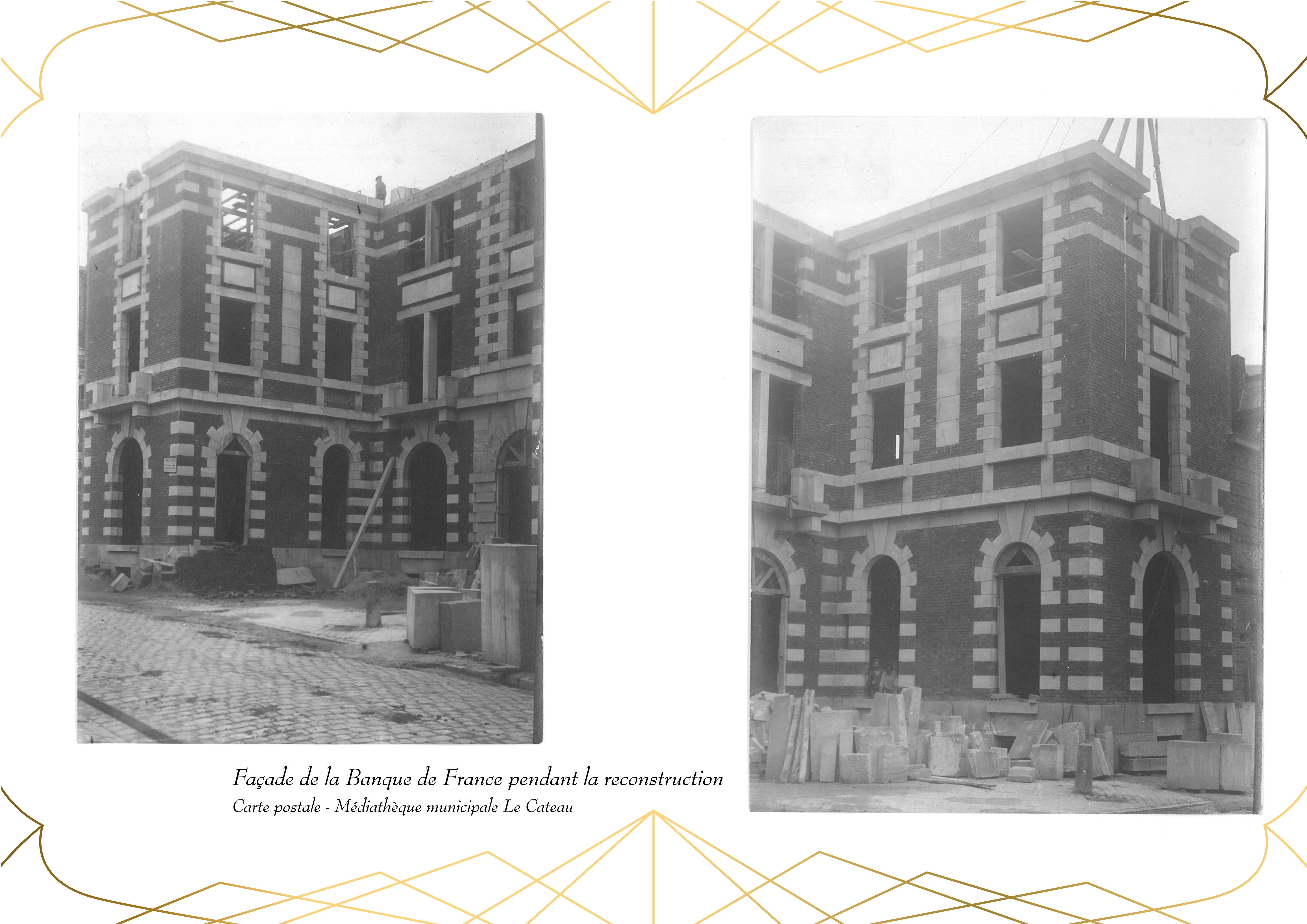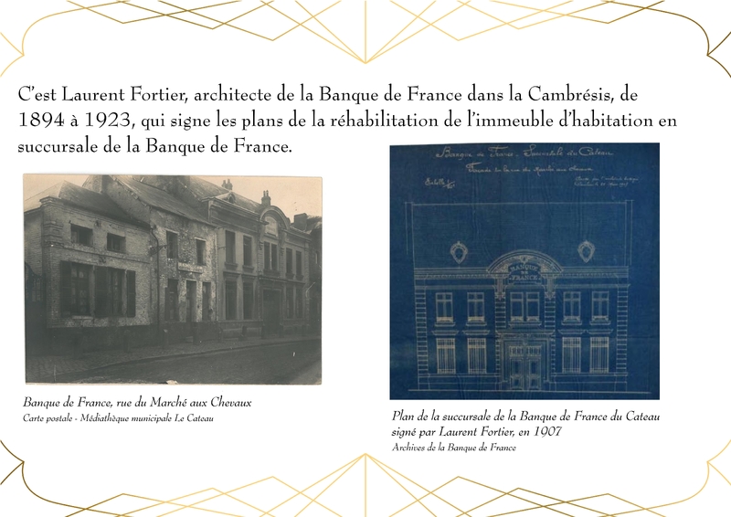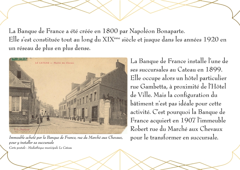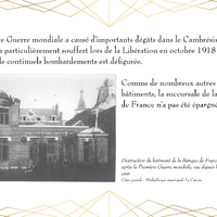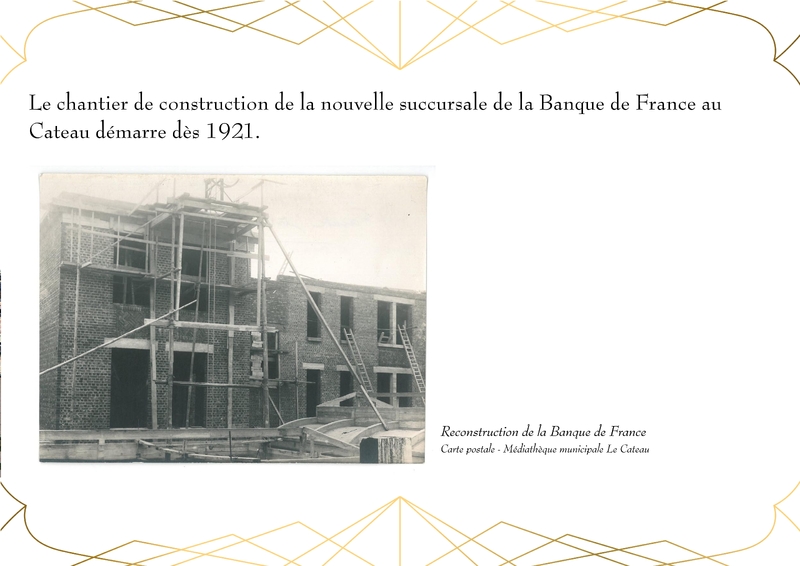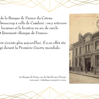 Entièrement détruit lors de la libéraion de la ville en 1918, Le bâtiment de la Banque de France, qui abrite actuellement la Médiathèque du Cateau, est rénové en 1920.
