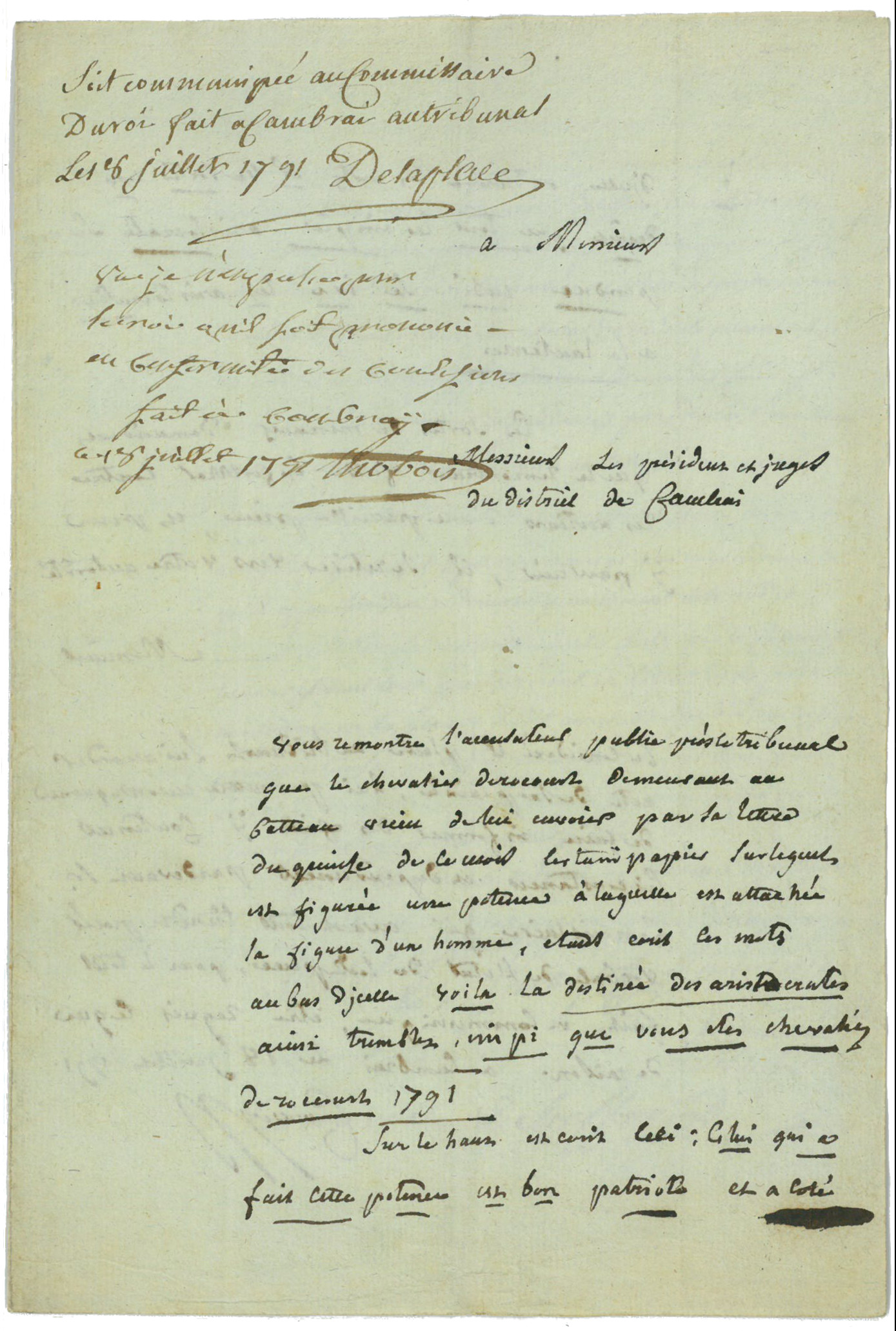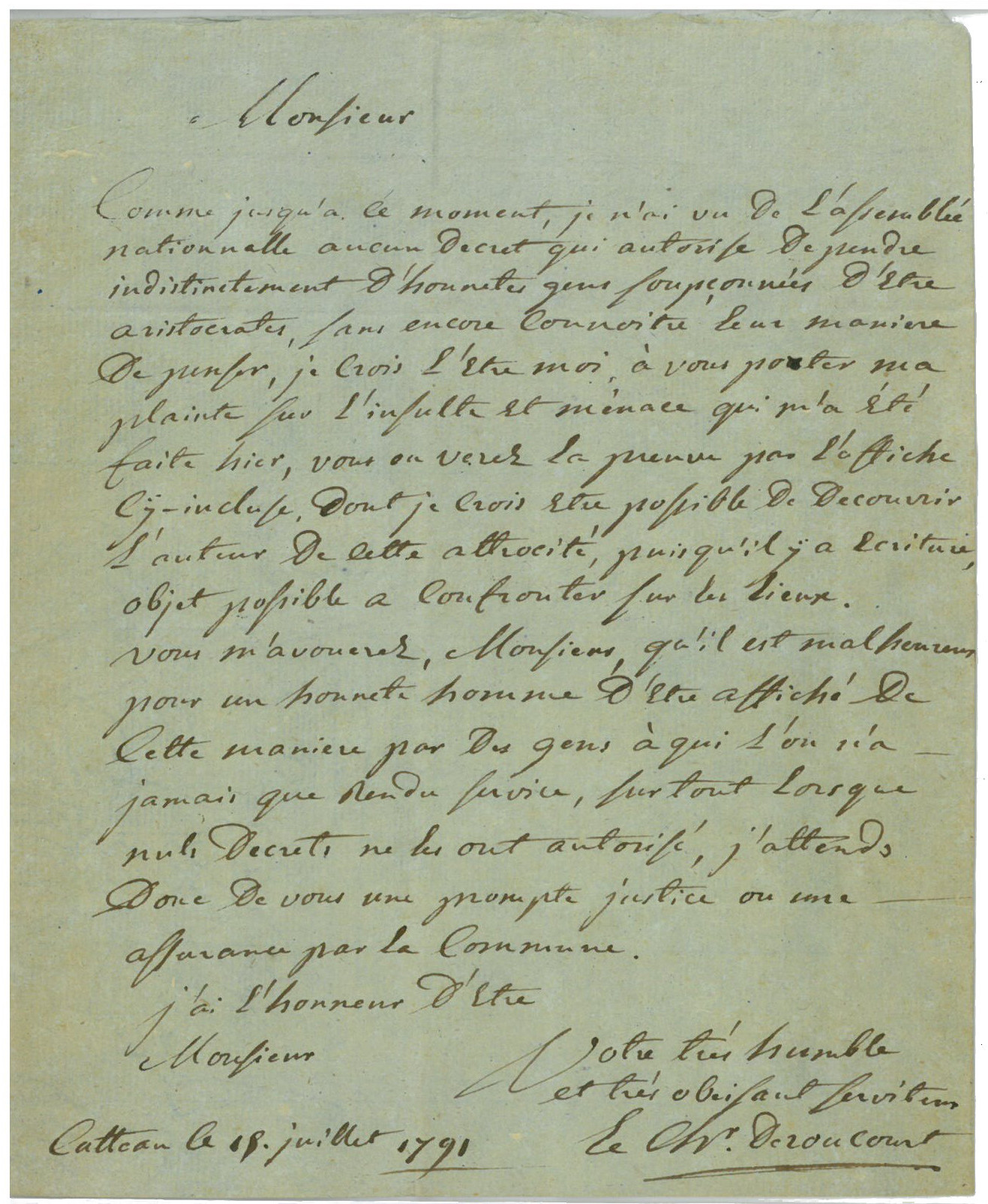 "Comme jusqu'à ce moment je n'ai vu de l'assemblée nationale(sic) aucun décret qui autorise de pendre indistinctement d'honnêtes gens soupçonnés d'être aristocrates.. je crois l'être moi, à vous porter ma plainte sur l'insulte et menace qui m'a été faite hier... Vous m'avouerez Monsieur, qu'il est malheureux pour un honnête homme d'être affcihé de cette manière..."