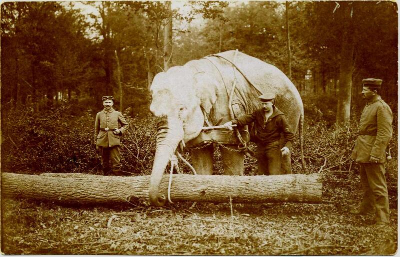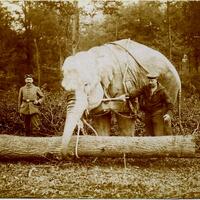 Photographie d'un éléphant à la manœuvre au bois d'Ors par les soldats allemands lors de la Première Guerre mondiale