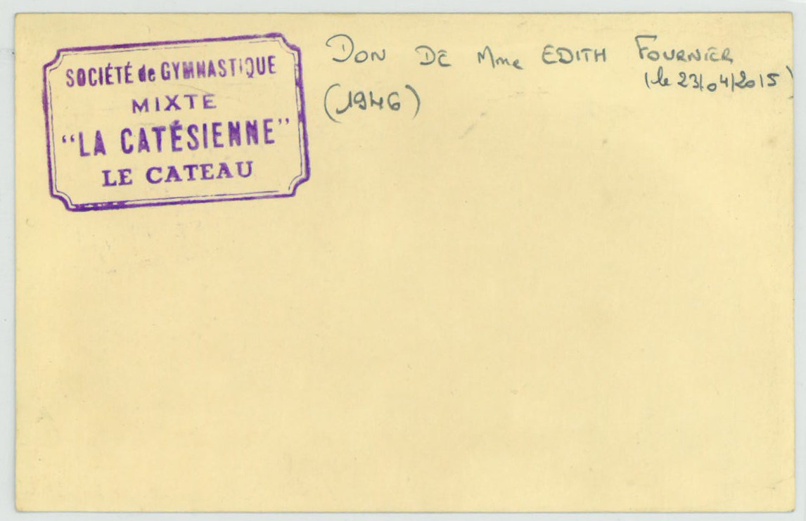 Société de gymnastique mixte, 'La Catésienne', Le Cateau, groupe de jeunes filles dans le jardin public, 1946