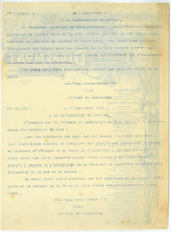Ordre de réquisition des chambres de la Kommandantur le 8 septembre 1918
