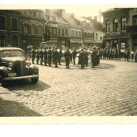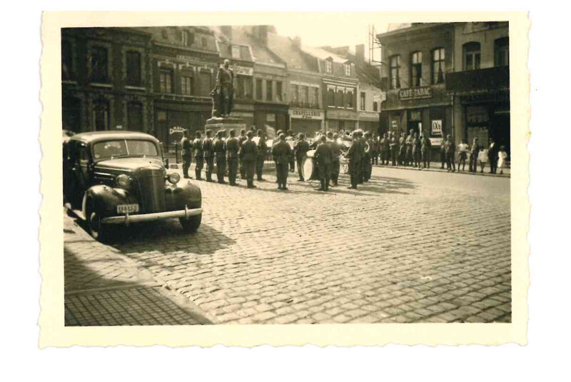 Photographie d'une fanfare allemand devant la statue du Maréchal Mortier en 1940
