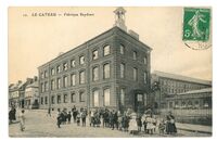 Carte postale ancienne montrant le bâtiment principal de l’usine Seydoux au Cateau, visible depuis la rue principale. L’architecture évoque un bâtiment administratif à l’entrée du complexe industriel. Scène de rue calme, quelques passants visibles.Type : Carte postaleMots‑clés : Fonds Gérard Lemoine, Industries, Seydoux (Famille), Textiles et tissus, Carte postale allemande -